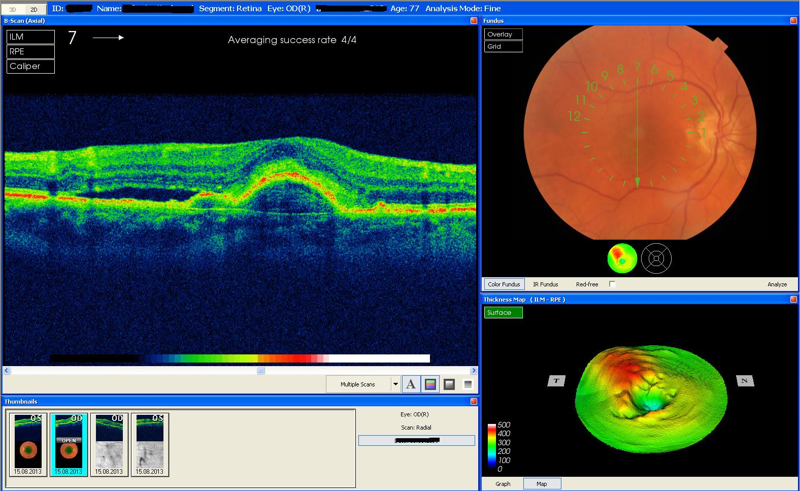 Die innere Struktur der mehrschichtigen Netzhaut im am Augenhintergrund kann mit den herkömmlichen Verfahren nicht genau untersucht werden. Durch die OCT-Technik ist dies heutzutage in einer kurzen Untersuchungszeit völlig unschädlich, ohne Strahlenbelastung und ohne Berührung des Auges möglich. Durch die OCT-Untersuchung gelingt eine exakte Darstellung der verschiedenen Schichten der Netzhaut und damit eröffnet sich eine neue Dimension der Diagnostik und Verlaufskontrolle bei verschiedenen Netzhauterkrankungen.