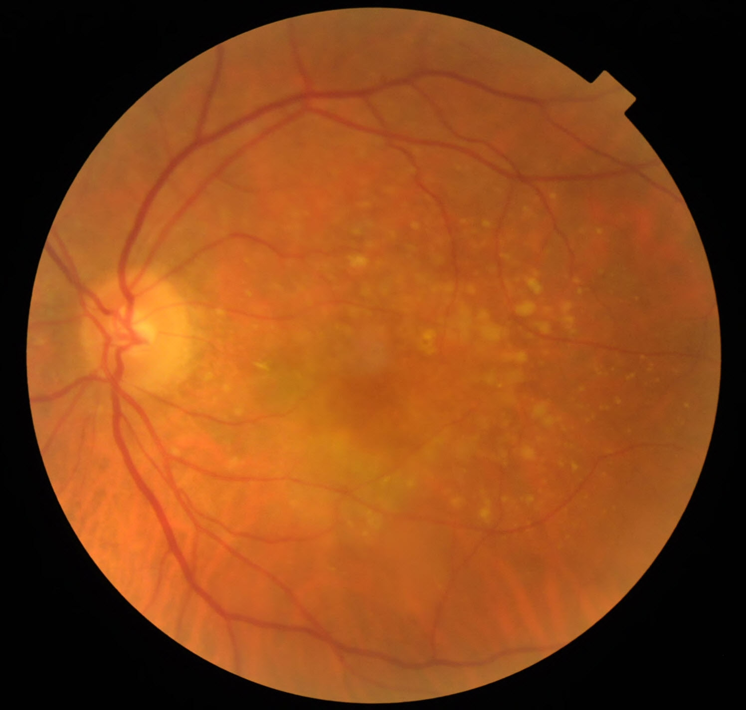 Gelbliche Ablagerungen (Drusen) bei fortgeschrittener trockener AMD.