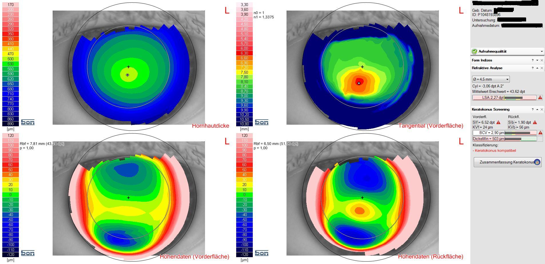 Die Analyse der Hornhaut mittels einer hochauflösenden Topographie ist darüber hinaus auch vor der Durchführung refraktivchirurgischer Eingriffe, z.B. LASIK oder der Implantation von Multifokallinsen bei der Operation des Grauen Stars erforderlich.