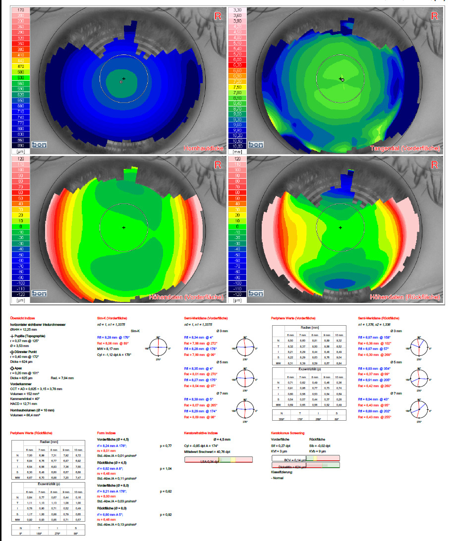 Die genaue Erfassung und Darstellung der Hornhaut ermöglicht eine Reihe von Erkenntnissen. Das Wissen um die genaue Beschaffenheit der Hornhaut hilft z.B. bei der Anpassung von Kontaktlinsen wie auch bei der Diagnostik von Hornhauterkrankungen wie Keratokonus.
